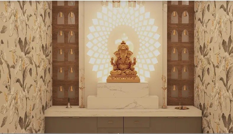 Serene pooja rooms designed with traditional elements, creating a peaceful and spiritual atmosphere at home.